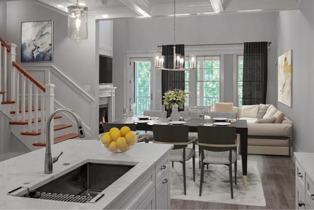 Large dining island w/pendants above